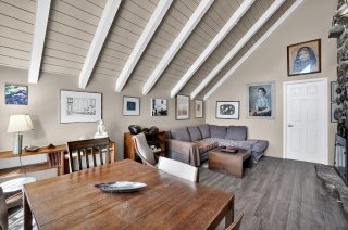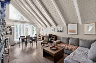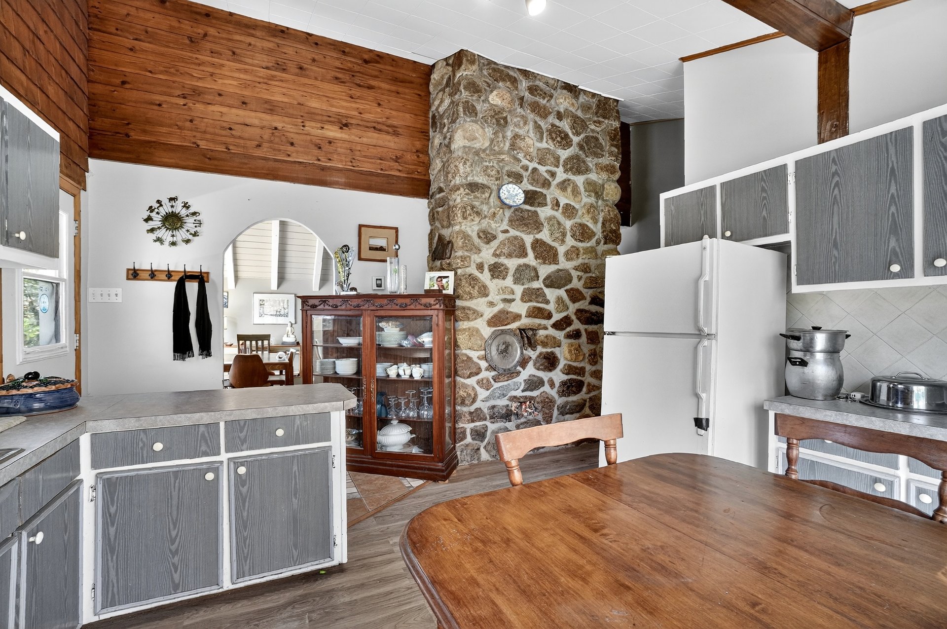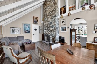 apparentes et son imposant foyer en pierre. Cet espace